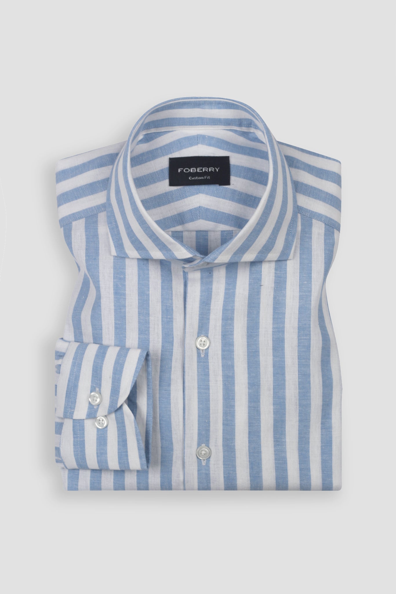 The crisp sky-blue stripes give it a modern edge, while the cut-away extreme collar brings a hint of sophistication fit for both boardroom presence and relaxed evening style. Lightweight and naturally textured, this shirt delivers effortless polish for men who value comfort as much as confidence.