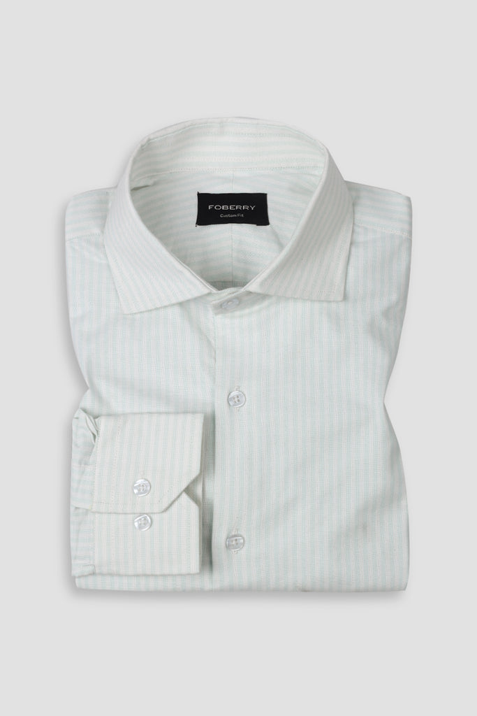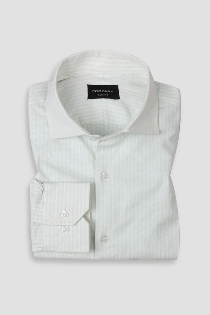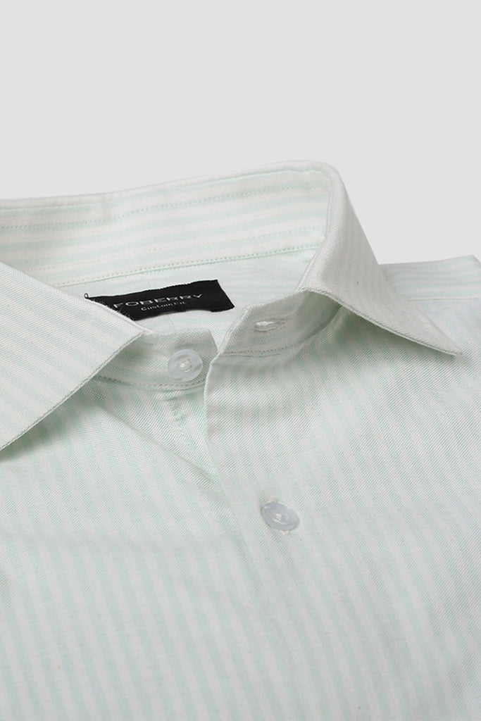 A gentleman never settles for anything less! This soft green-striped shirt has all that it takes to be in the limelight. Elegance and class are fused together with this crispy soft green-striped cotton. Stitched in a cut-away classic collar without placket to make it simple yet exclusive.